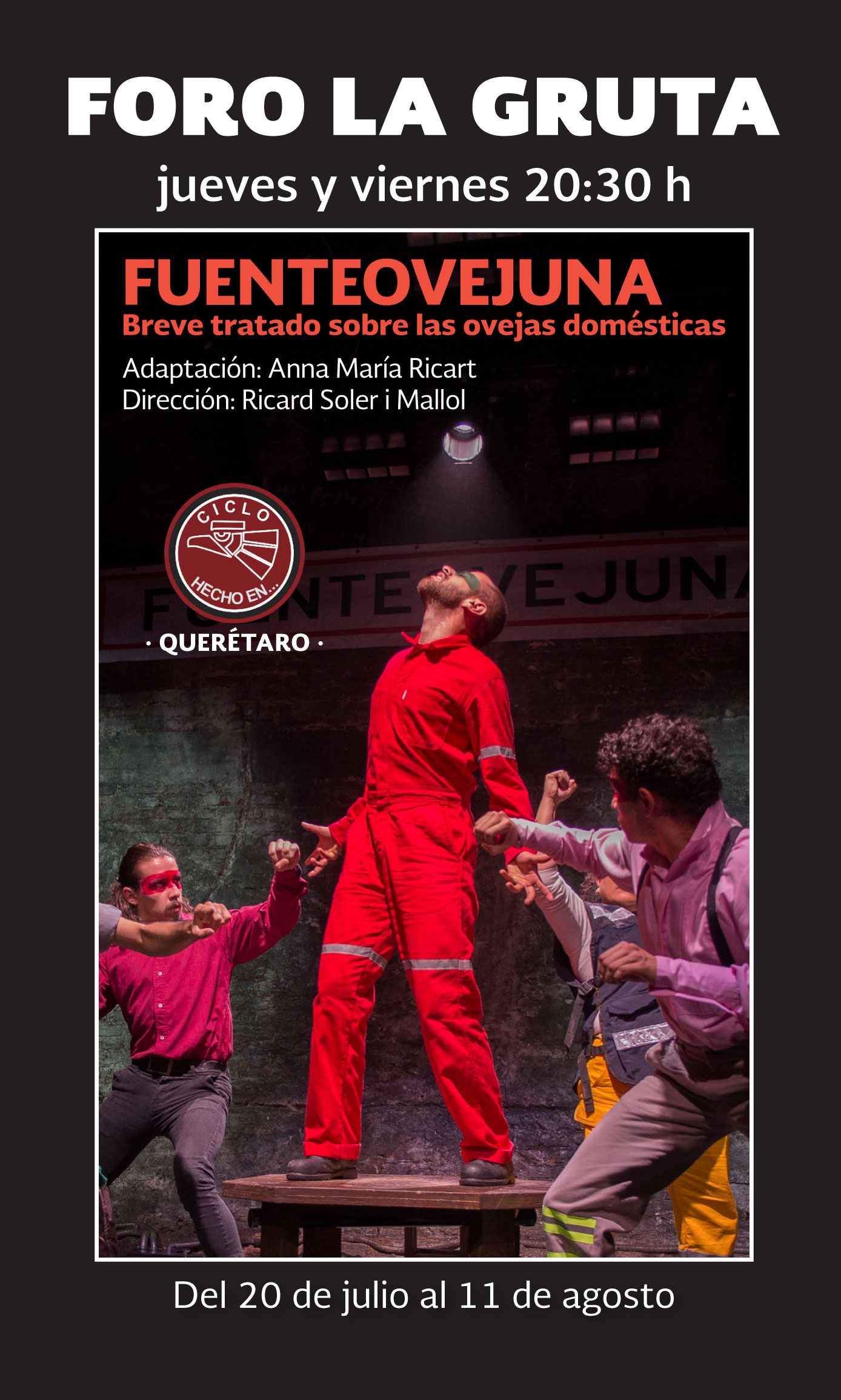 Este clásico de Lope de Vega es la historia de un pueblo que, cansado de las atrocidades de un comendador corrupto y violador, decide unirse para combatir y finalmente matar a su opresor. En esta adaptación que hace Anna María Ricart, los actores en escena, serán víctimas y culpables de aquello que están narrando.