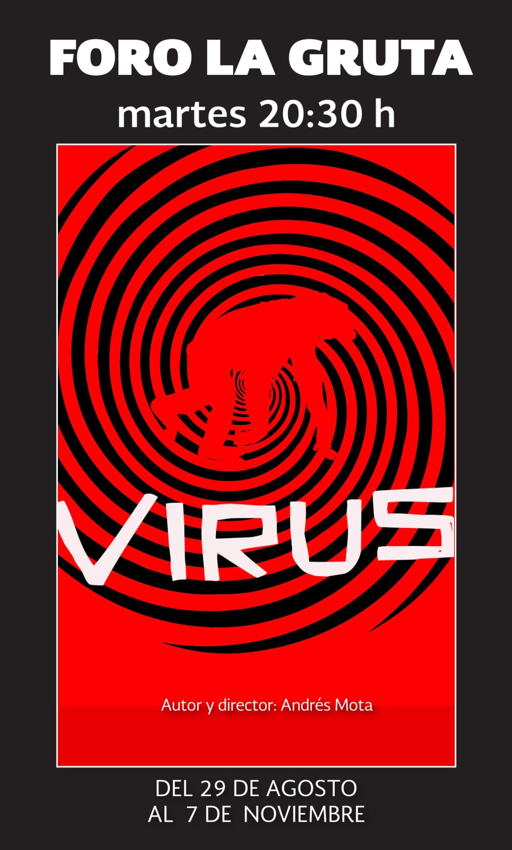 A través de la lógica del sueño, la saturación sensorial y la descomposición de las palabras, esta obra busca enfrentarnos con el ser parasítico que habita en nuestro interior. Virus es una lucha entre huésped y parásito, voluntad y perversidad, verborrea y silencio. Una confrontación con los mecanismos del lenguaje y el pensamiento racional.