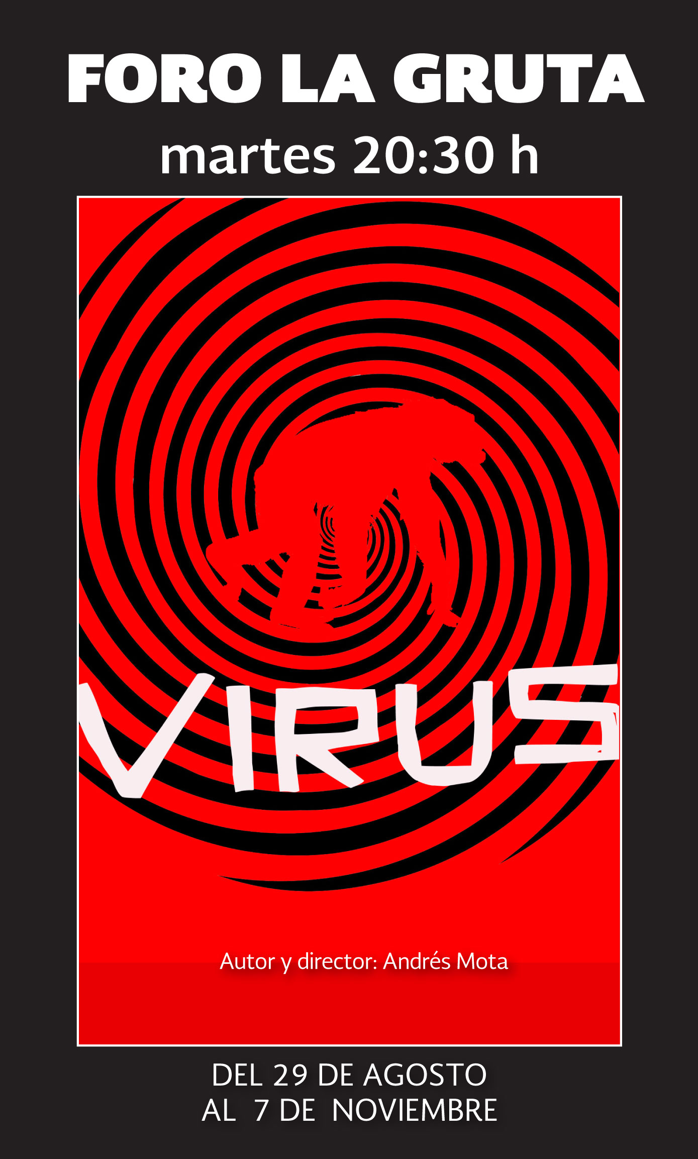 A través de la lógica del sueño, la saturación sensorial y la descomposición de las palabras, esta obra busca enfrentarnos con el ser parasítico que habita en nuestro interior. Virus es una lucha entre huésped y parásito, voluntad y perversidad, verborrea y silencio. Una confrontación con los mecanismos del lenguaje y el pensamiento racional.