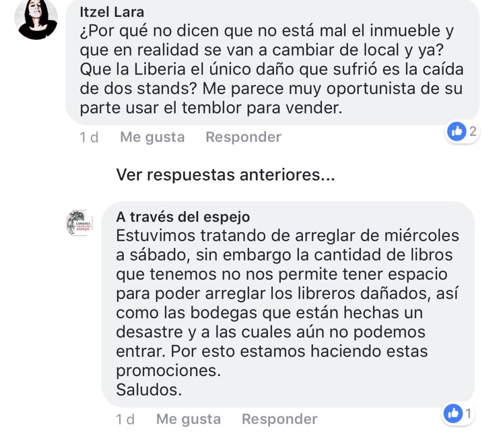 De manera masiva y al auspicio de la tragedia tras el sismo de hace más de una semana, las librerías de viejo dan la nota. Como muchos compartí en mis redes sociales la publicación que hizo una librería de viejo ubicada en una de las zonas más afectadas. La Librería A través del espejo, anunció que todos los libros que estuvieran en la entrada costarían 10 pesos y 60 por ciento en todos los libros que estuvieran en el piso. Las fotografías mostraban unos libreros caídos y cientos de libros en el piso. Compartí la propaganda y usted, que fue o que leyó los comentarios en las publicaciones de esta falsa propaganda, notó que no cedieron su lucro inhumano. Hasta donde escribo no han sido denunciados ante las autoridades, ni mucho menos dan la cara.