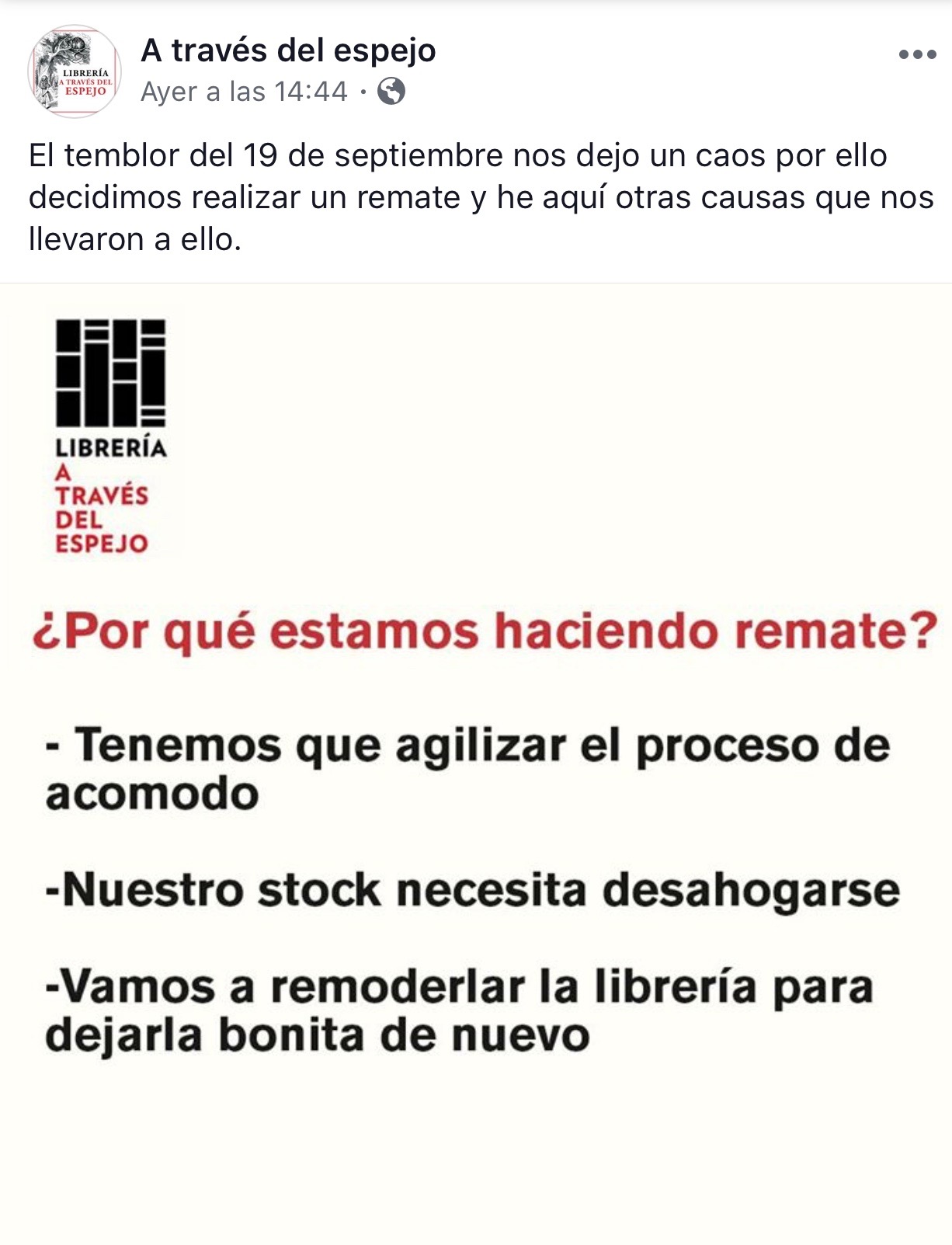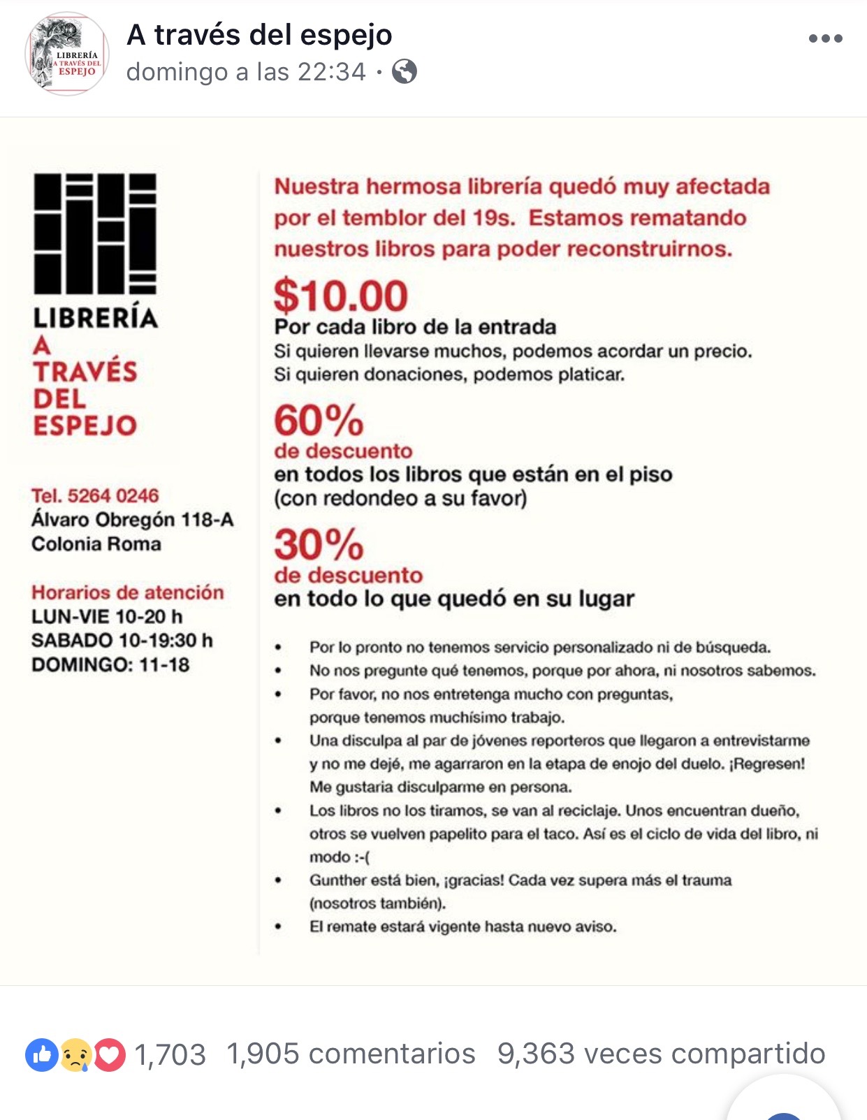 De manera masiva y al auspicio de la tragedia tras el sismo de hace más de una semana, las librerías de viejo dan la nota. Como muchos compartí en mis redes sociales la publicación que hizo una librería de viejo ubicada en una de las zonas más afectadas. La Librería A través del espejo, anunció que todos los libros que estuvieran en la entrada costarían 10 pesos y 60 por ciento en todos los libros que estuvieran en el piso. Las fotografías mostraban unos libreros caídos y cientos de libros en el piso. Compartí la propaganda y usted, que fue o que leyó los comentarios en las publicaciones de esta falsa propaganda, notó que no cedieron su lucro inhumano. Hasta donde escribo no han sido denunciados ante las autoridades, ni mucho menos dan la cara.
