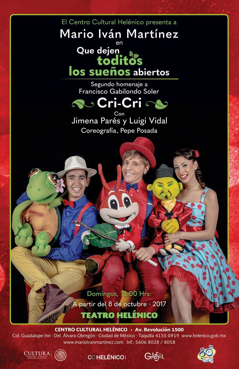 Espectáculo familiar alrededor de la figura de Francisco Gabilondo Soler, Cri-Cri, un artista que conoció a fondo la teoría de su arte y que tocó a múltiples generaciones. Amén de compartir temas célebres del Grillito Cantor, el actor Mario Iván Martínez y un dueto singular de jóvenes cantantes, bailarines y actores, presentan un montaje que resalta aspectos poco conocidos de su literatura y comparten canciones que han quedado en la sombra de su merecida notoriedad. El espectáculo nos remite a través del teatro, la música y la danza a la riqueza de nuestra idiosincrasia infantil.