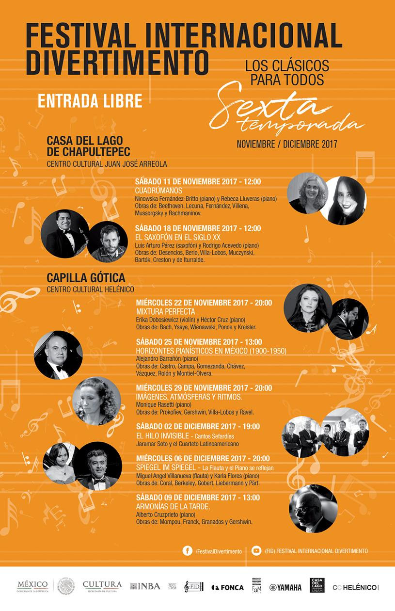 Durante los meses de noviembre y diciembre se llevará a cabo la VI temporada del Festival Internacional Divertimento. El principal objetivo del festival es acercar al público a los clásicos de manera amigable, dar cabida a músicos jóvenes y mostrar el talento de concertistas consolidados en una serie de conciertos únicos con programas que en su diseño, buscan ofrecer un variado horizonte musical.